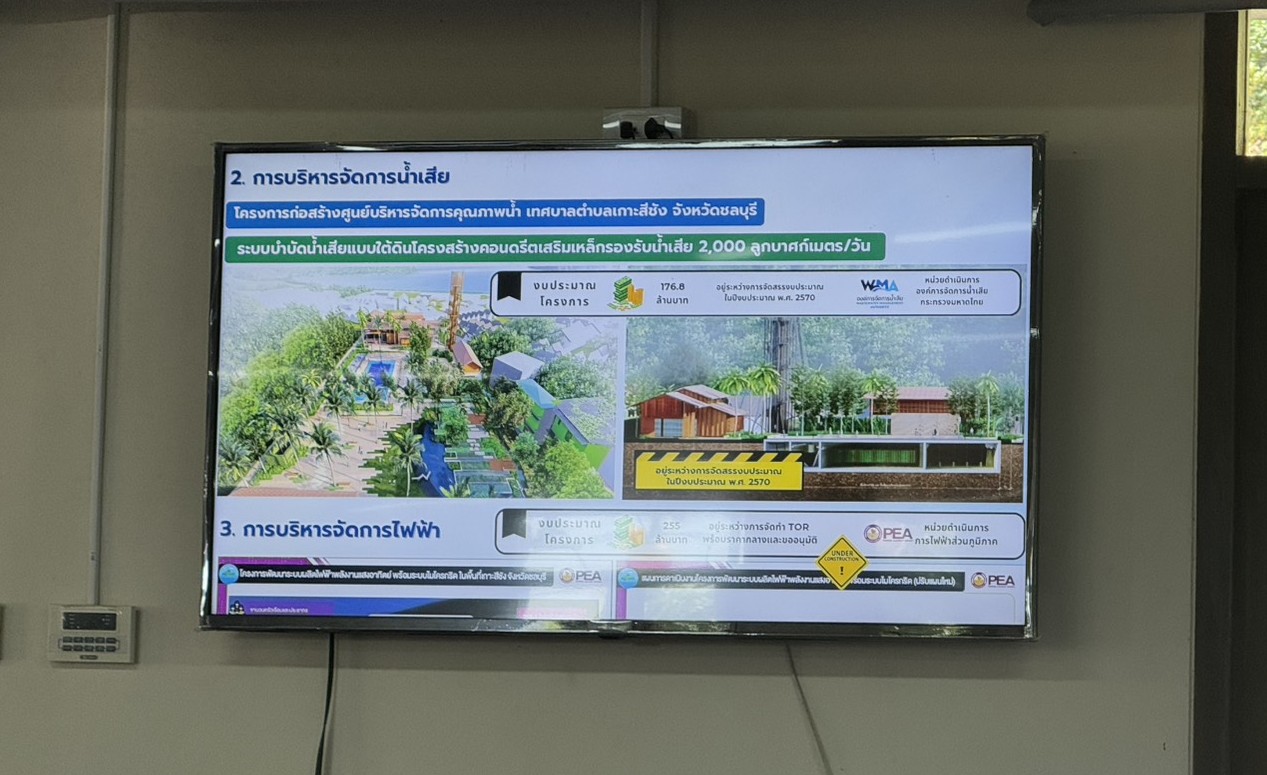 วันที่ 17 ธันวาคม พ.ศ. 2568 เวลา 10.30 น. พลอากาศเอกสถิตย์พงษ์ สุขวิมล ราชเลขานุการในพระองค์พระบาทสมเด็จพระเจ้าอยู่หัว ลงพื้นที่ติดตามความก้าวหน้าโครงการพัฒนาเกาะสีชัง โดยมีนายอนุทิน ชาญวีรกูล นายกรัฐมนตรีและรัฐมนตรีว่าการกระทรวงมหาดไทย พร้อมด้วยคณะรัฐมนตรี และหัวหน้าส่วนราชการที่เกี่ยวข้องเข้าร่วม ณ ห้องประชุมศูนย์การเรียนรู้ประวัติศาสตร์เกาะสีชัง อำเภอเกาะสีชัง จังหวัดชลบุรี ในการนี้ ว่าที่ร้อยตรีพัฒนภูมิ อังศุสิงห์ รองผู้อำนวยการปฏิบัติการ องค์การจัดการน้ำเสีย ได้เข้าร่วมประชุม สำหรับความคืบหน้าการดำเนินการด้านการบริหารจัดการน้ำเสีย องค์การจัดการน้ำเสีย อยู่ระหว่างการขอรับการจัดสรรงบประมาณ โครงการก่อสร้างศูนย์บริหารจัดการคุณภาพน้ำ เทศบาลตำบลเกาะสีชัง เป็น ระบบบำบัดน้ำเสียแบบใต้ดินโครงสร้างคอนกรีตเสริมเหล็กรองรับน้ำเสีย 2,000 ลูกบาศก์เมตรต่อวัน